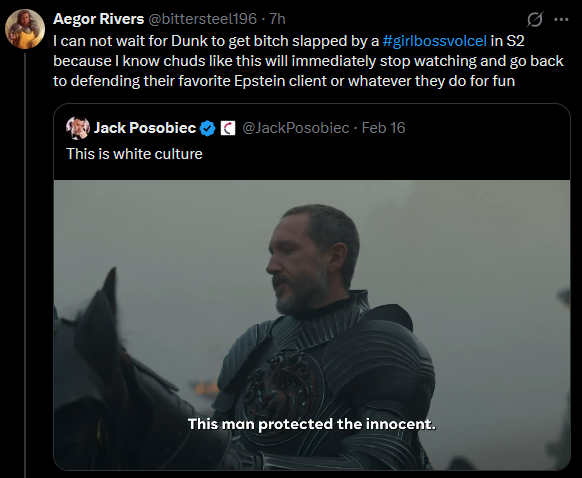 https://x.com/ADragonDemands/status/2024219644660252723The prediction for HotD S3 is that the general consensus will be positive because it will have a lot more action (given that the main complaint in S2 was that the final battle got cut from S2 and got pushed to episode 1 of S3) just like Seasons 5-7 of GoT getting unbridled praise for its action despite getting more and more retarded as it went on, but the bookfags will hate it because of the damage done to the story.