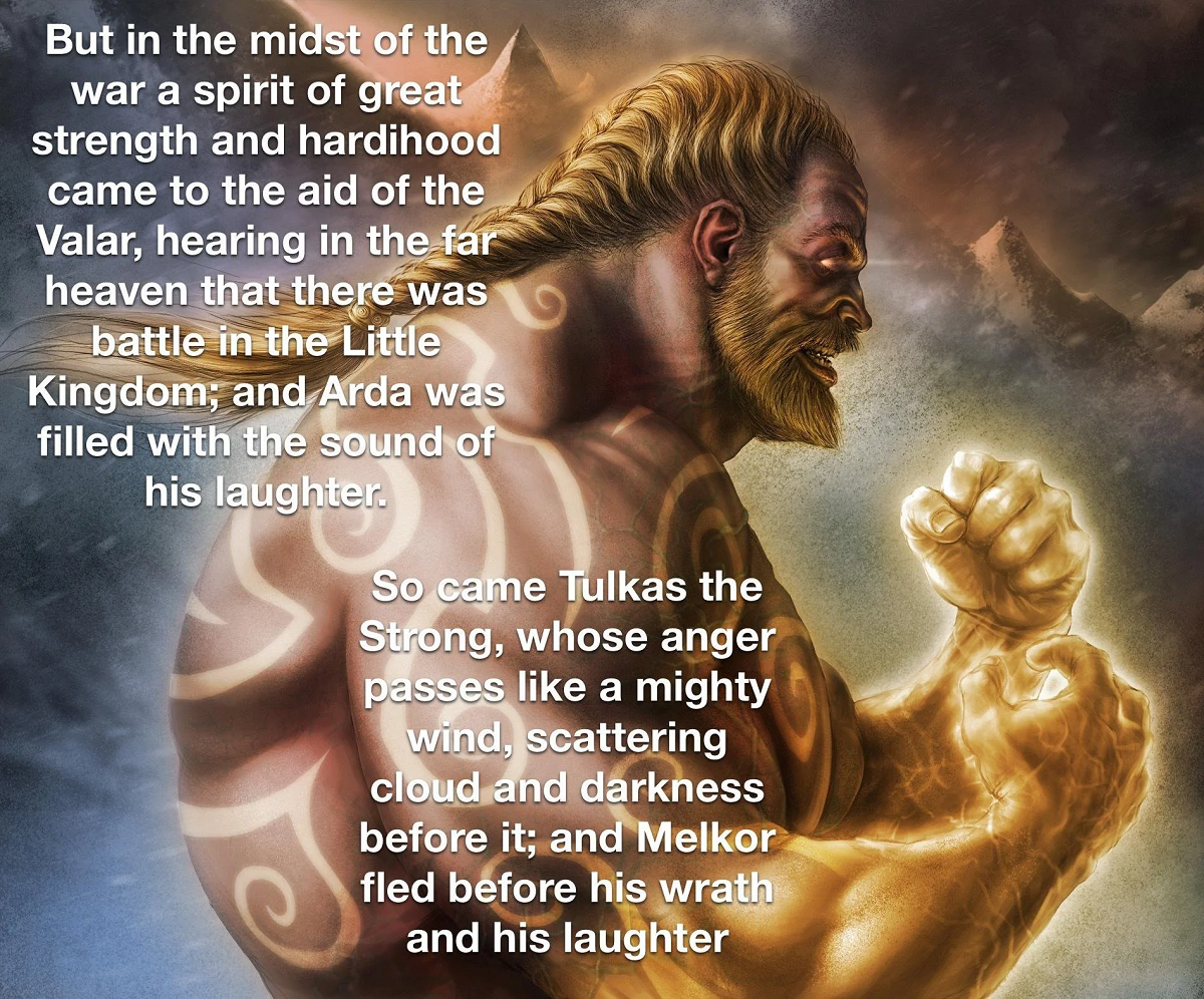 >>218082318He is but Tulkas was THE fighter and barehanded wrestled Melkor into submission like it was just another Sunday to him. I can't say positively that Tulkas was the mightiest but I think he was. If Tom Bombadil had a patron (not saying he did) it would have been Tulkas