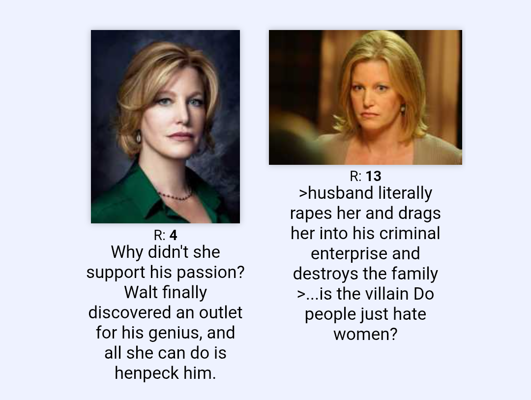 What I dont get is:Walter: does bad shit for his family>NOOO WALTER NOOOOOOTed: Skyler please help me evade taxes>yes teddy bear uwu happy birthday mr president"Le bitch wife" wouldn't even be as prevalent if it wasn't for this crap