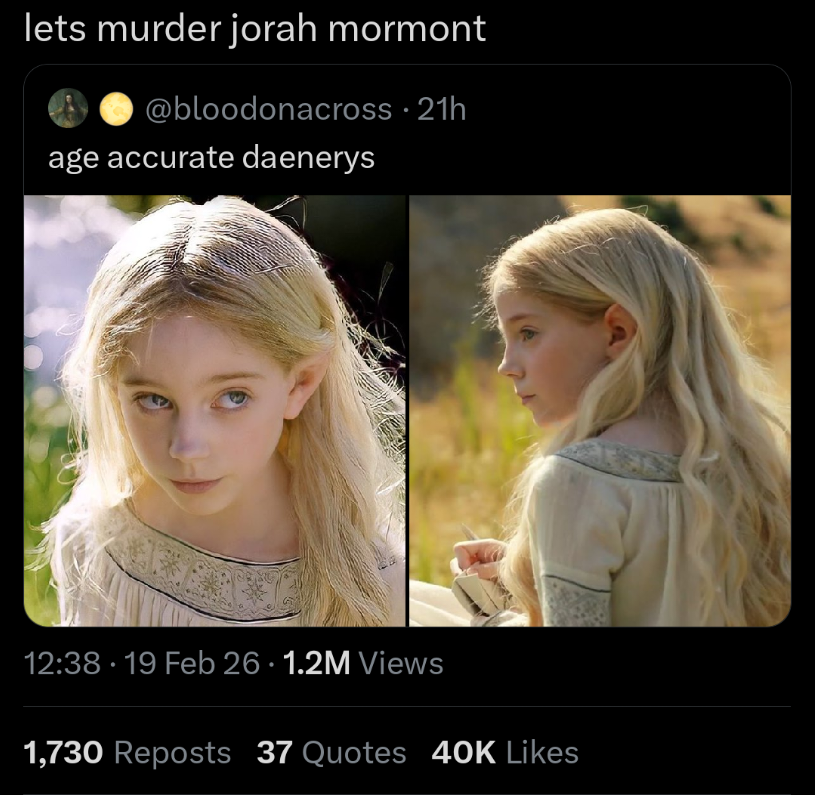 still can't get over the fact that HOTD cut out the canon brown girl solely because she'd end up making Rhaenyra look worse, whitewashed white woman wins out kek
