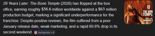 >>218140639Its not just that, its also a ton of loose threads that seem to exist almost to mystery box the movies.For instance the community in 28 years is given a zombie baby to raise, that seems like it'd be more of a big deal as a plot point. We could argue that maybe they'd just make a movie about that later but the way these threads are laid just seems like they'd be better fit to a series with multiple POVs.Another example is the end credits scene with the first movie's character, clearly there's some breadcrumb being laid with what happened to him, there's also the stuff with the cured zombie pajeet, and to explain why everyone calls the zombies alphas instead of just the ones from the village.If they're not retconning the second movie there's a lot of questions around the carriers who remain unaffected by the infection and what happened in Paris.It also would've been a lot more interesting to spend more time (in a multi episode structure) with the military survivors in the first movie before it all fell apart.