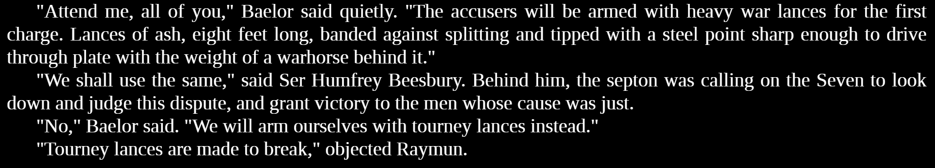 >What the fuck did you just say about me, you little bastard? I’ll have you know I was knighted first out of all the squires in the Red Keep, and I’ve been involved in numerous secret raids on Blackfyre usurpers, and I have over 300 confirmed slayings. I am trained in Dornish warfare and I’m the top archer in all the Southron kingdoms. You are nothing to me but just another target. I will snuff out your bastard bloodline with precision the likes of which has never been seen before on this Earth, mark my fucking words. You think you can get away with saying that rubbish to me with a raven’s letter? Think again, bastard. As we speak I am contacting my secret network of spies across the Seven Kingdoms and all of your traitorous secrets will be revealed so you better prepare for the storm, turncloak. The storm that wipes out the pathetic little thing you call your “life”. You’re fucking dead, boy. My cousin Lord Bloodraven can be anywhere, anytime, and he can kill you in over seven hundred ways, and that’s just with Dark Sister. Not only is my house extensively seasoned in the art of warfare, but we have access to the entire arsenal and martial talent of the Kingsguard, the Goldcloaks, and all the leal Great Houses of the Realm and we will use them to their full extent to wipe your bastard’s ass off the face of the continent, you little shit. If only you could have known what unholy retribution your little “clever” comment was about to bring down upon you, maybe you would have held your fucking tongue. But you couldn’t, you didn’t, and now you’re paying the iron price, you godsdamned idiot. I will shit fury all over you and you will drown in it, like we drowned your false king Daemon in a rain of arrows on the Redgrass Field. You’re fucking dead, bastard.