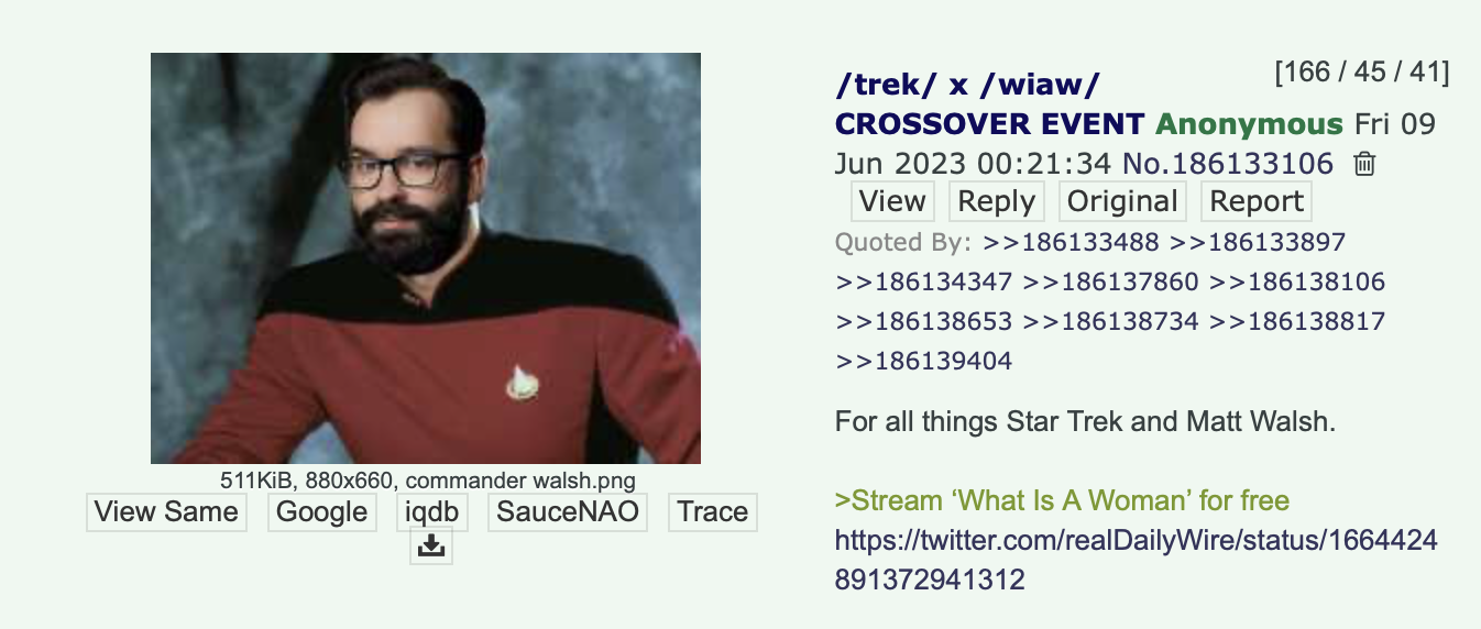 >>218175674>Way too many gay trans klingon episodesIf that's how you want to view it, fine. I personally view it in the lens of "individual liberty versus preserving culture" lens which is a real issue we're facing every day but done in an appropriately alien allegory. I won't try to change your view because it's your opinion but my view is different. Cheers