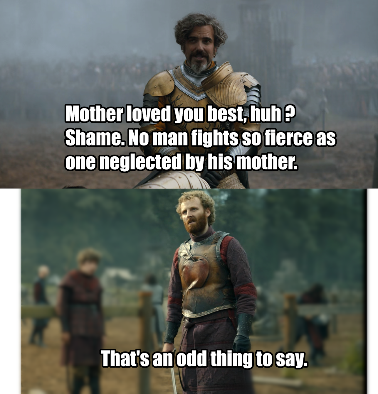 >>218171045>fratricide notwithstanding.He conspired with a hedge knight to cause a scene so that he, under the cover of a trial by combat, could slay his own older brother and seize the throne. The gods hate a kinslayer. It is known.