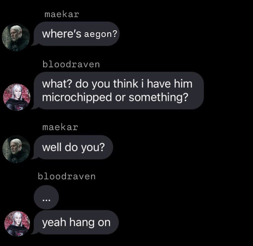 >>218170901Yeah but it's probably like>"Fuck my son ran away god fucking damn it. Bloodraven find him for me">"Oh he's just riding around in the Reach? Not in any danger, not getting abused, not going hungry, etc">"Fine just keep an eye on him"When you do have a GPS tracker like that you probably don't feel as much urgency to send the royal troops to go recover your son also Maekar's kind of a shit dad to begin with, I know it's medieval times and princes can be spoilt retards but how do you lose track of multiple sons simply traveling to a town for a tournament