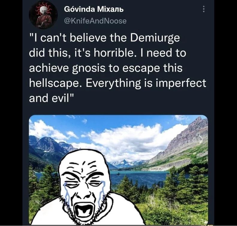 >>218177950Lol this. Just the laziest "deep" position to hold. And most of the people talking about it have never read a single gnostic text.