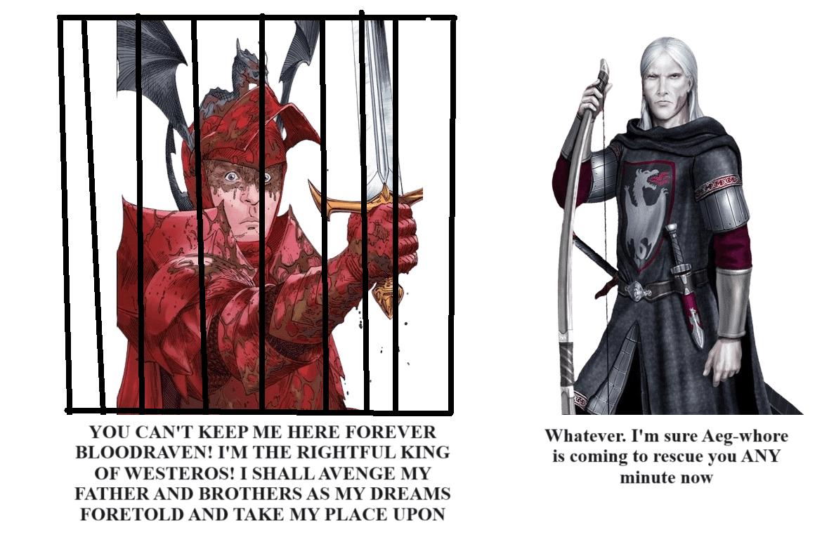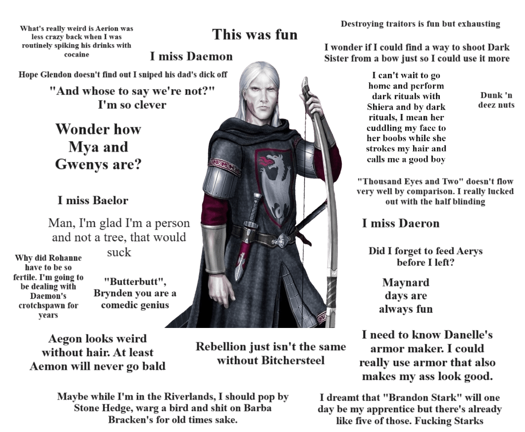 >What the fuck did you just say about me, you little bastard? I’ll have you know I was knighted first out of all the squires in the Red Keep, and I’ve been involved in numerous secret raids on Blackfyre usurpers, and I have over 300 confirmed slayings. I am trained in Dornish warfare and I’m the top archer in all the Southron kingdoms. You are nothing to me but just another target. I will snuff out your bastard bloodline with precision the likes of which has never been seen before on this Earth, mark my fucking words. You think you can get away with saying that rubbish to me with a raven’s letter? Think again, bastard. As we speak I am contacting my secret network of spies across the Seven Kingdoms and all of your traitorous secrets will be revealed so you better prepare for the storm, turncloak. The storm that wipes out the pathetic little thing you call your “life”. You’re fucking dead, boy. My cousin Lord Bloodraven can be anywhere, anytime, and he can kill you in over seven hundred ways, and that’s just with Dark Sister. Not only is my house extensively seasoned in the art of warfare, but we have access to the entire arsenal and martial talent of the Kingsguard, the Goldcloaks, and all the leal Great Houses of the Realm and we will use them to their full extent to wipe your bastard’s ass off the face of the continent, you little shit. If only you could have known what unholy retribution your little “clever” comment was about to bring down upon you, maybe you would have held your fucking tongue. But you couldn’t, you didn’t, and now you’re paying the iron price, you godsdamned idiot. I will shit fury all over you and you will drown in it, like we drowned your false king Daemon in a rain of arrows on the Redgrass Field. You’re fucking dead, bastard.