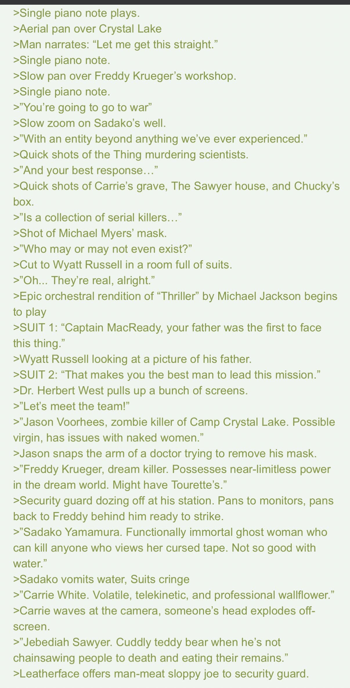 >>218176352You clearly have good taste.>The way he screams to wake up th clones and his scream turns into a digital compression mess is some A+ sound design.I 100% agree. They mixed it in such a way that the sudden scream is just slightly louder than all the audio prior, so it catches you completely off-guard. The top-tier Voice-Acting by Peter Lurie also made it 100% believable as a GENUINE, guttural, authentic scream of pain & terror rather than some VA just "acting one out". That scream coming from a grown-ass adult male; one who even by that super-early point in what the Player has seen so far is someone presumed to have at least some kind of hard-edged Military Experience; communicates to the audience exactly HOW scary this unknown force is, and that they should be afraid of it too.And this is ALL communicated to the audience barely using any actual words. It's all 100% mood, cryptic visuals and implications that anyone watching instinctually understands, even if subconsciously. Communicating things to the audience like that completely non-verbally, especially levels of threat or reasons for a sense of dread, is such a lost art in the modern era of Horror.