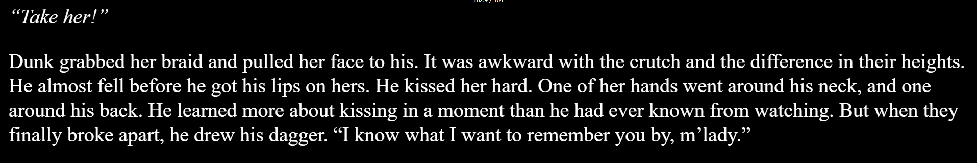 >>218179892In the White Book, where they recorded the feats of every knight in the kingsguard, every single knight (including Barristan) only had 1 page to their name. Granted, it's a big fucking book and the text is small.All except Duncan. 4 pages for Ser Duncan the Tall. Even with the book being big and the words being small. 4 fucking pages.And those were also the feats he accomplished WHEN he was officially already in the Kingsguard - we all know there's probably even more before that, which we the readers will discover more as we progress along with the novellas.Dunk is quite literally the Michael Jordan or Jesus Christ of Knighthood in Westeros. Bards across the realm, even in Essos, sing of his deeds by the Robert Baratheon Era. He's really just the GOAT.