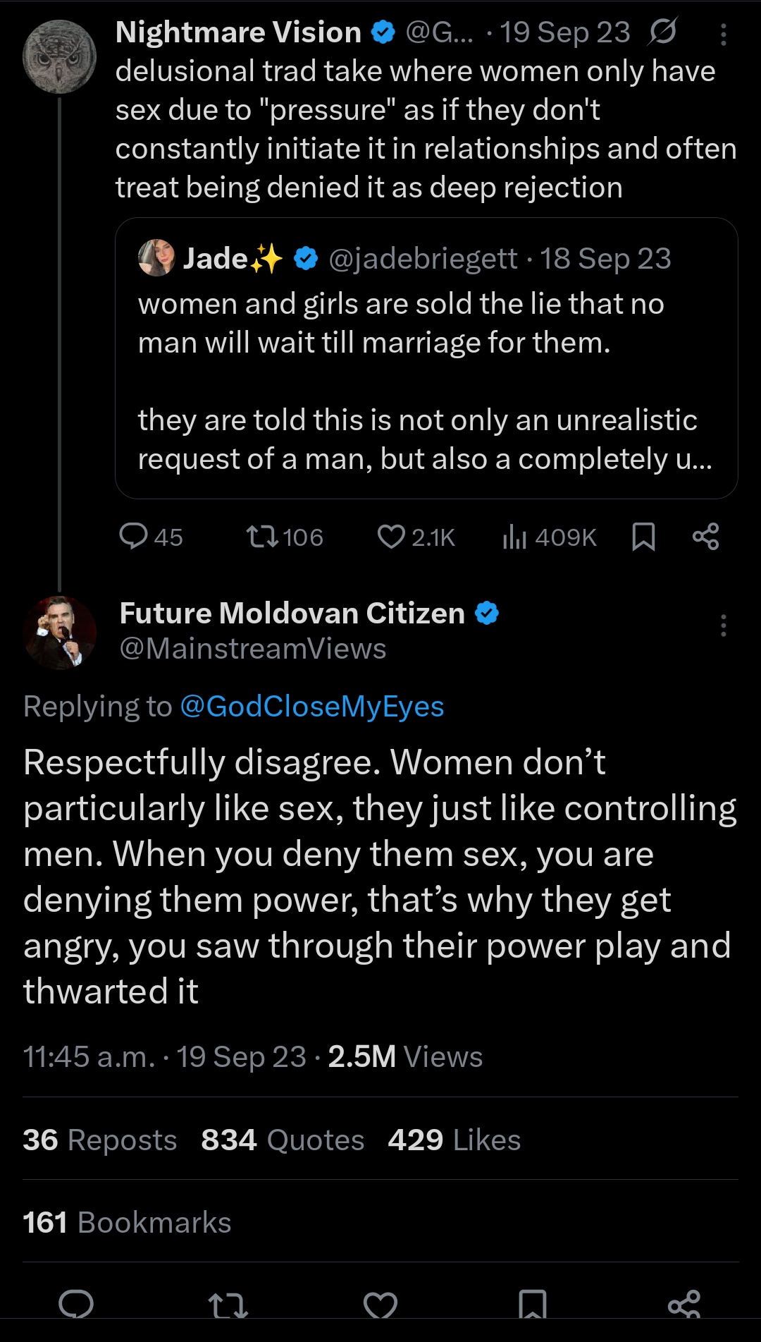 >>218189032I used to think this, but I think people conflate not being able to make your partner orgasm with having bad sex, because the two often overlap, but they can be mutually exclusive categories. Having bad sex is a pretty strong indicator that your partner isn't attracted to you, but it's entirely possible for a woman to be unable to orgasm with a dude that she otherwise finds attractive. It sounds like a cope because the discourse on this issue has been mostly dominated by bitter women who despise men.