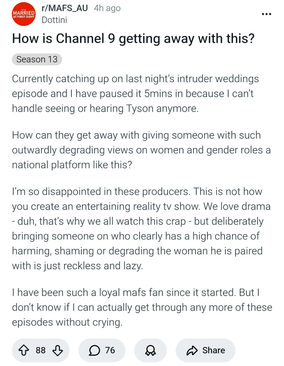 >>218182161A woman wrote this, and it's obvious even outside the fact that no man would be watching Married At First Sight.