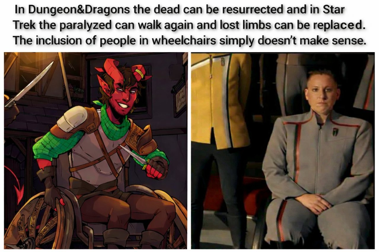 >>218183118desu people in wheelchairs in D&D are not THAT absurd, they just wouldn't be adventurers, nor would they be exploring any catacombs. Healing spells can be rare/expensive (much like modern medical treatments), but to pretend you can "adventure" in a wheelchair is just dense as fuck, and people who advocate for that can be clearly labeled as retards
