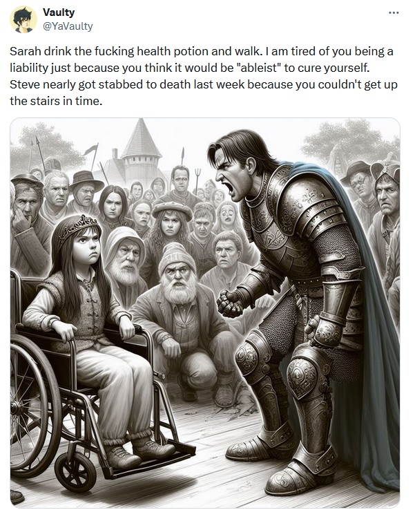 >>218183118it's completely ignoring that this has to be the most insulting shit to people in wheelchairs since I can not fucking imagine that someone in a wheelchair's fantasy self insert escapism would INCLUDE THEM IN THE FUCKING WHEELCHAIR