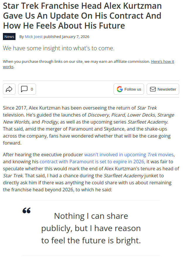 >>218198355Isn't that more because Secret Hideout's contract is (finally) running out? The Kurtzman slop has finally run out, true, but will the next thing actually be good?