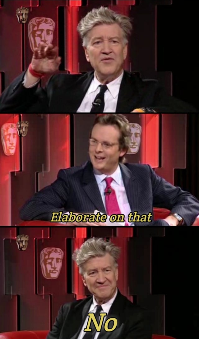 >>218194868>"subtext", "symbolism", "meta-narratives"I'll fight you there since if it doesn't exist in a relatively obvious way in the media itself it's not there, I hate subtextLynch would love it though, or rather, he would love that it existed and could be interpreted however, reallysince he loved fucking with people>>218194883so A then