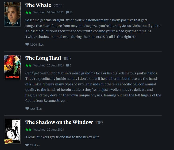 give me some funny letterboxd accounts, my feed has too many intellectuals
