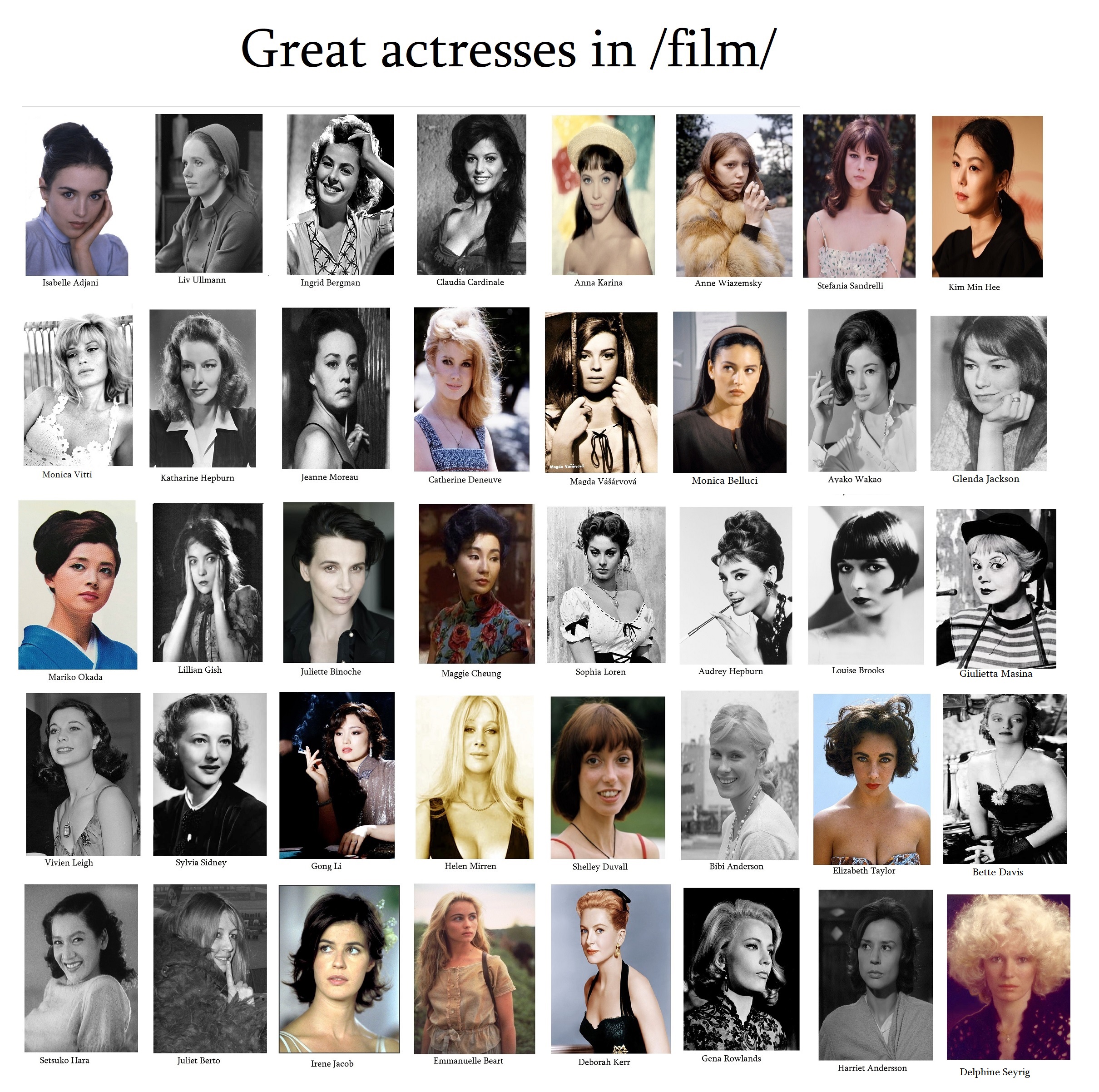 >>218225792I can definitely see that.There are plenty of good actresses included yet some glaring omissions, like the anon who made it has a visible grudge or something. For example, Huppert is objectively more /film/ than Helen Mirren, Glenda Jackson, or that bitch from The Handmaiden.