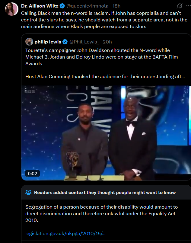 Remember it's not about the word, it's about picking the right targets. Some poor white guy with a disability at a film award show? He's the right target. Uppity white liberals at Baftas? They're the right target. They can open up all barrels and go for it. But there are plenty of other situations where they suddenly say context matters. They like to push things when they know they can break a target. Other situations where they can't get at someone, they don't care and give up. But this situation, they'll keep applying pressure until some real shit happens.