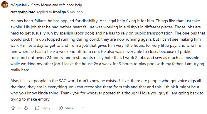 >>218222656I checked a few posts but didn't see anything further than him being homeless at times, I should have checked that account's more recent posts I supposeBut damn, the way she describes it, that sounds really miserable, poor guys.I'm sure there's parts she's leaving out however, because napkin maths would imply he earned around $300k from Aqua Teen alone, and he started getting royalties in the later seasons. That was like $30k a year for a few hours effort, he could have been earning twice as much as the other guys working a $15/hr job with him.I can only assume he just tried to rely solely on that VA income for most of those years