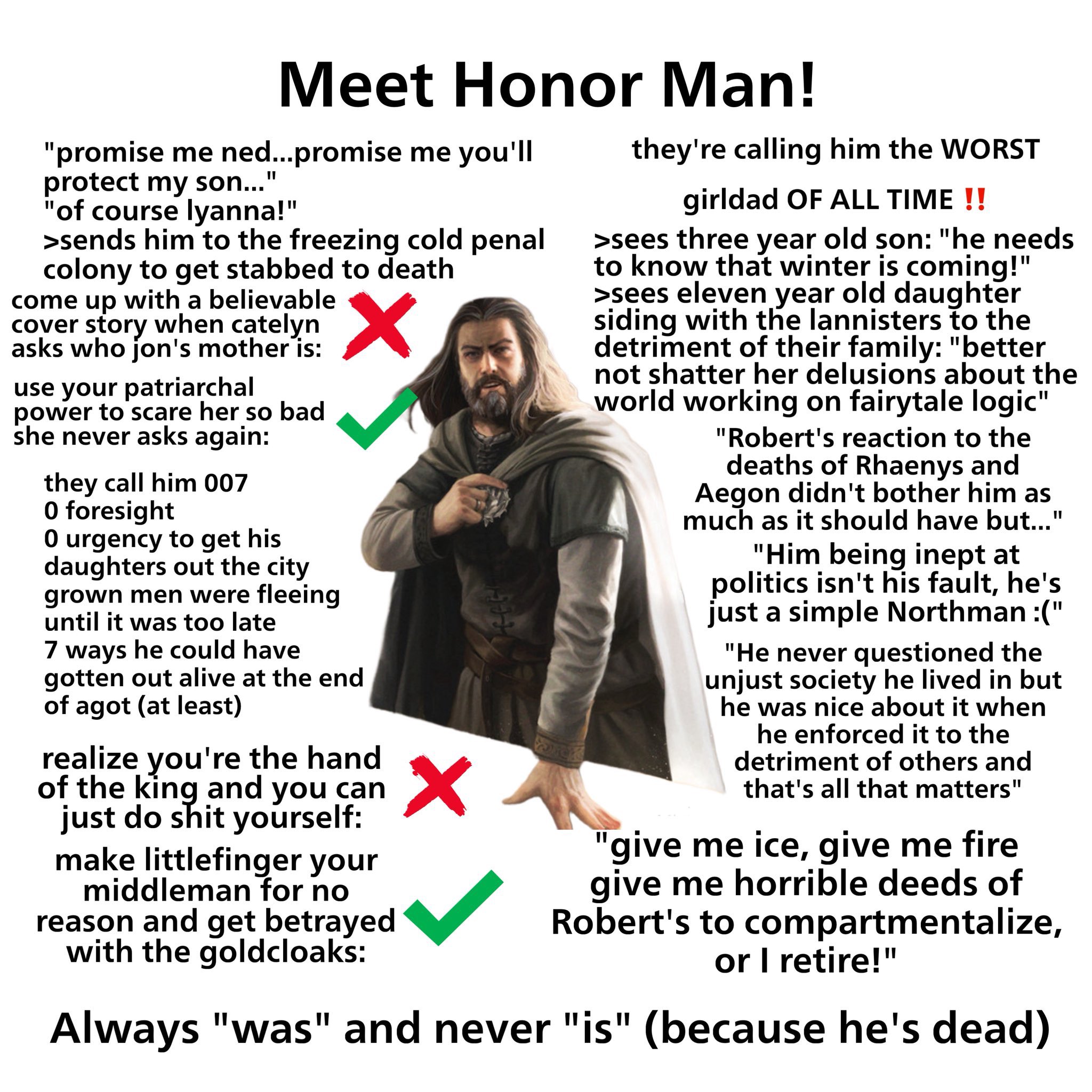 >Ned was just bad at southern politics, he was a good norfman!>despite having the best relationship with a King in Stark history, there's no evidence the North is benefitting at all>fought 2 wars for Robert but got nothing in return, Ned is still worried about food for the winter>completely oblivious to how much debt Robert had racked up, which could lead to another war in the future. Just needed to send a single letter to Jon Arryn asking about the state of the realm>did nothing to benefit the North through his relationships in the Vale and Riverlands>oblivious to the fact that Barbary Dustin hates him, that Roose and his heir are breaking his laws>makes no plans for his children's future>no small council position for any Northern lord>allows Mance to spend 10 years building up an army before investigating>was going to slaughter the direwolf pups without hesitation before Jon stopped him>follows the Old Gods but for some reason completely refuses to believe in supernatural shit like wargs or OthersNed bros.... not like this