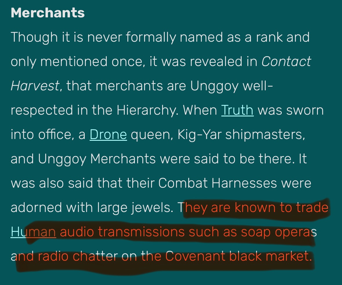 Fun fact about halo lore. Grunts apparently enjoyed human TV shows and movies. They used to trade episodes of shows on a black marketThat means… canonically, they would be shit posting with humans on the 2555 equivalent of /tv/ about slop and calling them retards onlinehttps://halo.fandom.com/wiki/Unggoy
