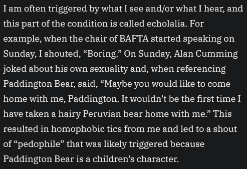 >>218214788So we can talk about this controversy >tourettes man literally invited because the movie he's in is a documentary of his life dealing with these crippling impulses caused by tourettes and has to live in isolation >Gets invited, goes about as well as you'd expect by the "woke" that like to celebrate the disabled but not actually deal with them