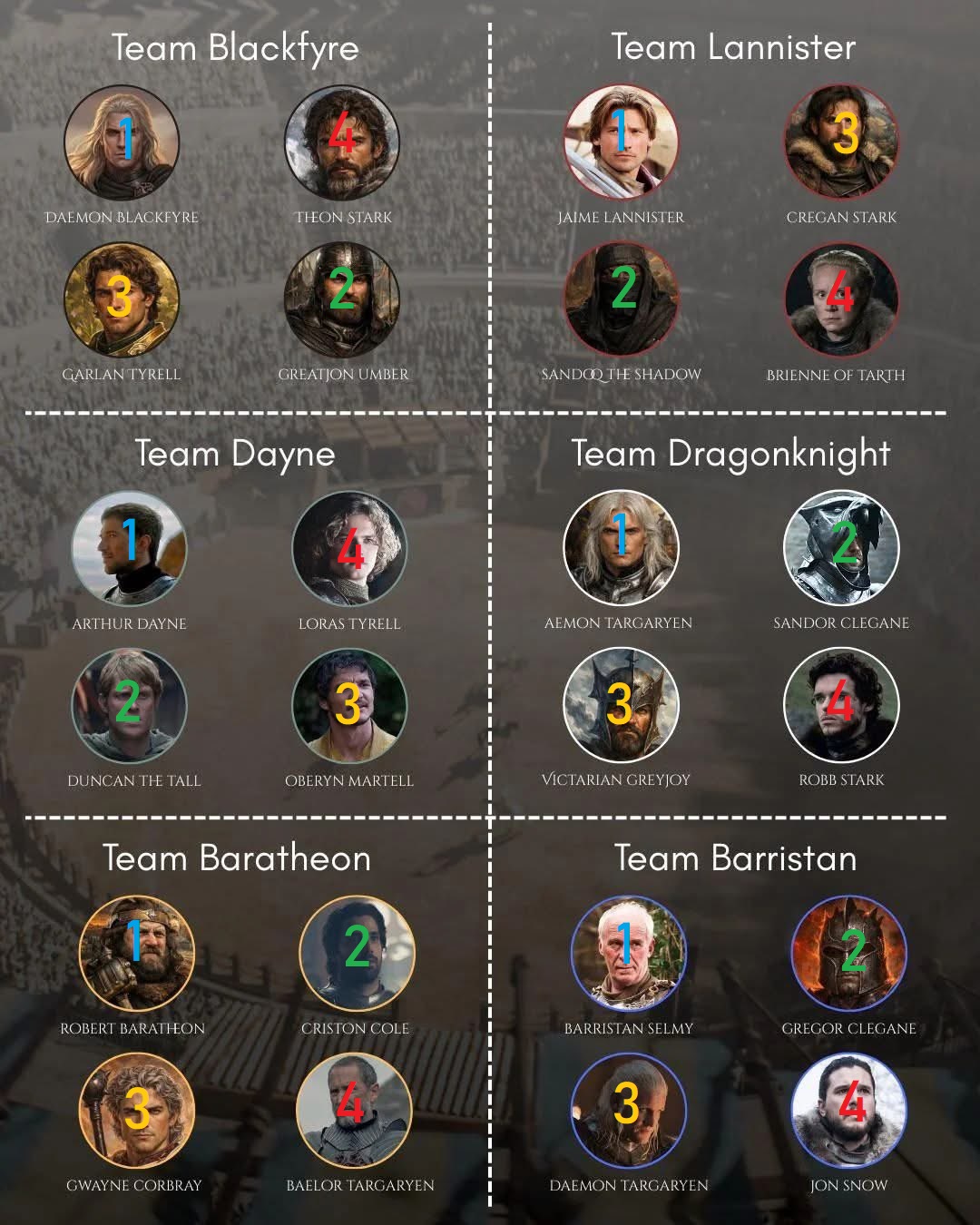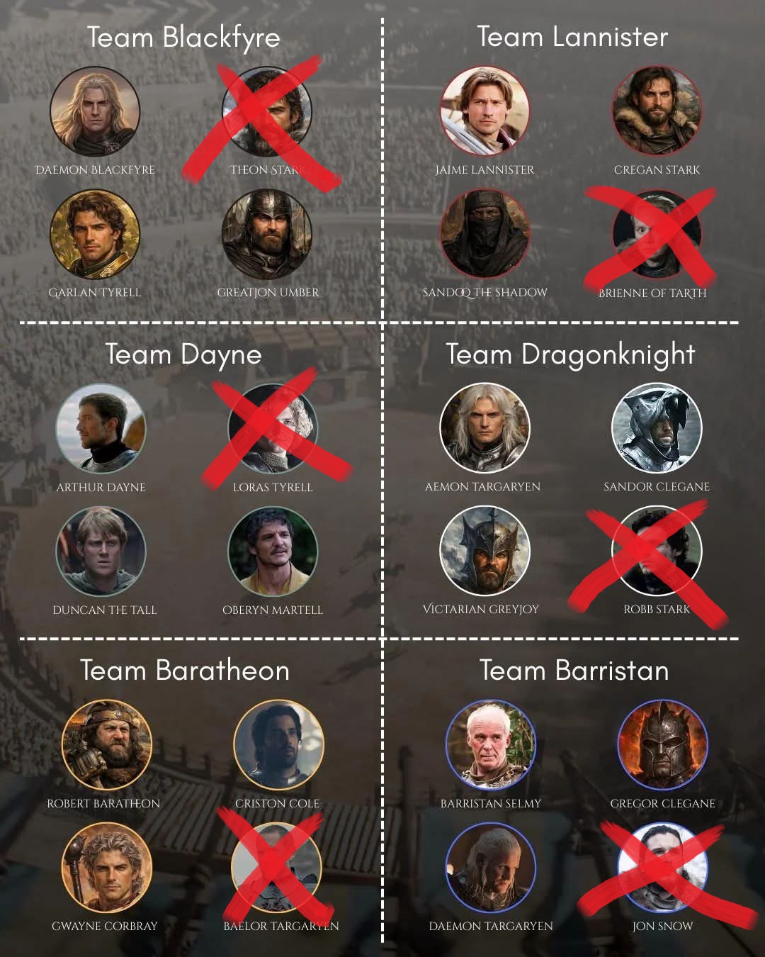 >>218218038team blackfyre wins fairly easily>>218218064Daemon is better than Dayne, Theon Stark by actual feats is the greatest warrior/commander in the history of Westeros and makes The Mountain look like a nice guy. Garlan Tyrell is way better than Loras. And Greatjon is considered top 5 in Westeros by Jaime
