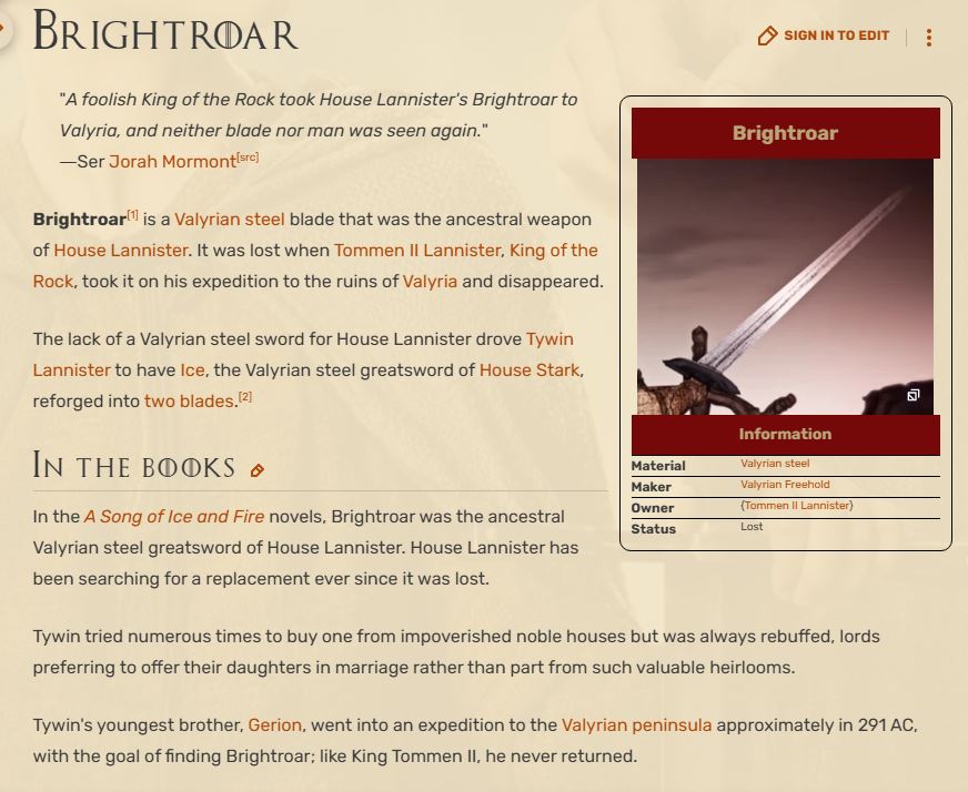 >>218219664see >>218219682I freely admit I could be wrong, I've never read world of ice and fire, however>ancestral sword of house lannisterexcuse me? the lannisters have never had a valaryian sword, its a major irritation for tywin, you don not know what you are talking about at all