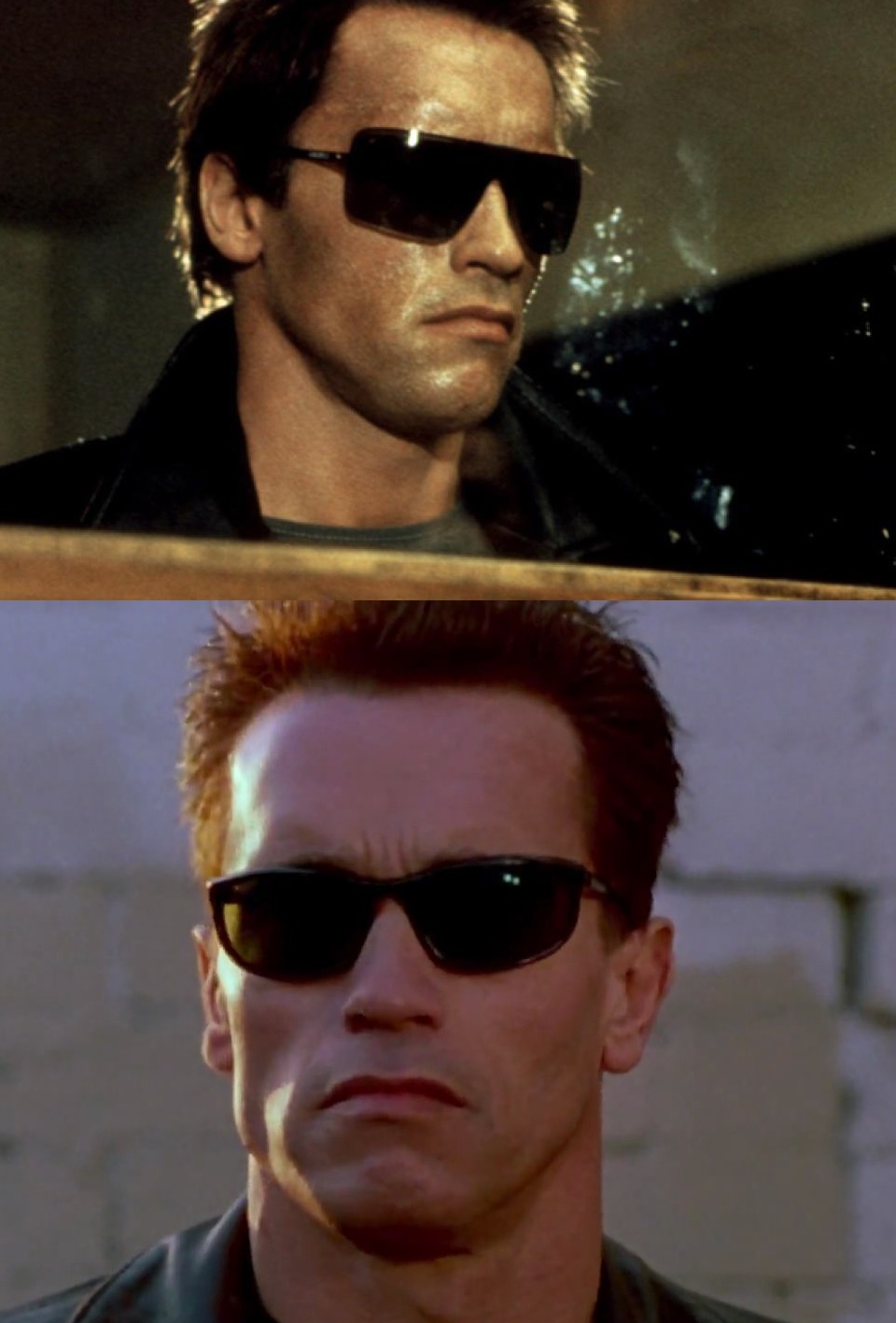 >Terminator 1>The Terminator is damaged and wears a pair of sunglasses to hide his inhumanity>Terminator 2>The Terminator decides to wear sunglasses at night to look "cool"This is why T1 > T2