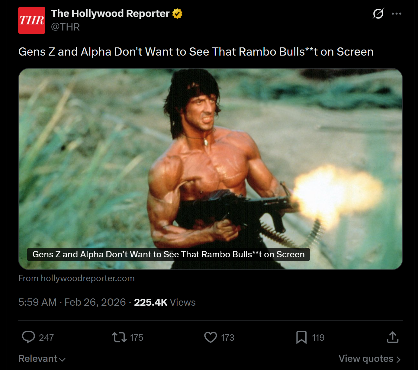 >>218224421>That Rambo BullshitWho writes these, what are they basing their dumbass headlines on. These are the same ones that wrote "Woodie's Bald Ass Head" right? They're trying to appeal to retarded zoomers. Who cares? Why are you posting it here? Why haven't you been range banned? Why did you cut your penis off?
