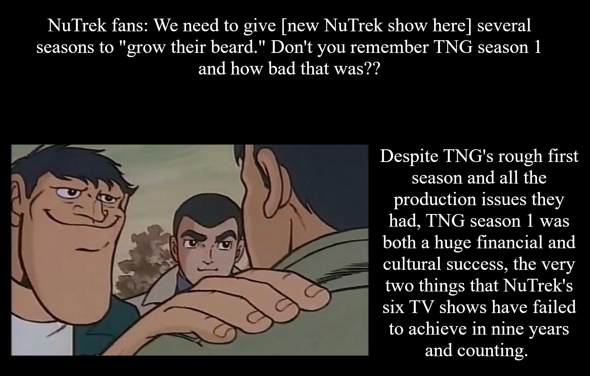 >>218227940'fans are furious'OBJECTIVELY FALSEas explained in previous threadYES! There were fans of TOS who disliked TNG. Some fans hated the fact that it features a new crew HOWEVERThe first season of TNG is widely considered a bad season of television, with plenty of real stinkers.Season two was a clear improvement, but it was season three when TNG genuinely became good.The main reason TNG survived its first two rough seasons, despite their overall quality, is precisely because the majority of Trek fans continued to support it. That support held even though there were TOS fanatics who disliked the new cast, the different tone, and the new era .By contrast, NuTrek doesn’t have that same goodwill behind it - and its low ratings reflect that.tl;dr some TOS fanatics disliked TNG, but majority of Trek fans supported it
