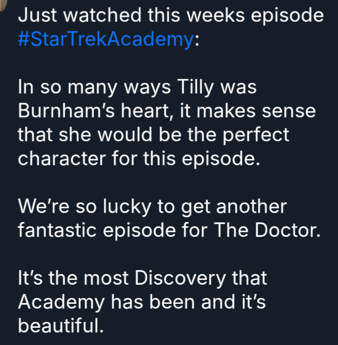 >>218234619And this is also why I think Lower Decks worked as well as it did. On one hand it was clearly a 'current thing' and 'modern audience' show, but it was made by people who really were fans of the earlier Trek shows. So we got the only real attempt to look at the older Trek ideas through a modern lens, and also the only real attempt to look at more modern cultural ideas using older Trek sensibilities. Couldn't have happened if they weren't a comedy. Strange New Worlds does OK at this too desu, it's just a bit bland. Discovery isn't bland but it is 'noisy', it doesn't know what it's trying to say. Starfleet Academy DOES know what it's trying to say, it's just a bit retarded. Don't get me wrong I'm a massive Trekkie and even like the new stuff (even Section 31 was fine as a B movie), it's just that it has pretty clearly changed over time. Right now it's not really pushing any kind of social or moral or ethical or philosophical envelopes, but there are embers of that attitude that can still be seen so I think it can get back in the groove.