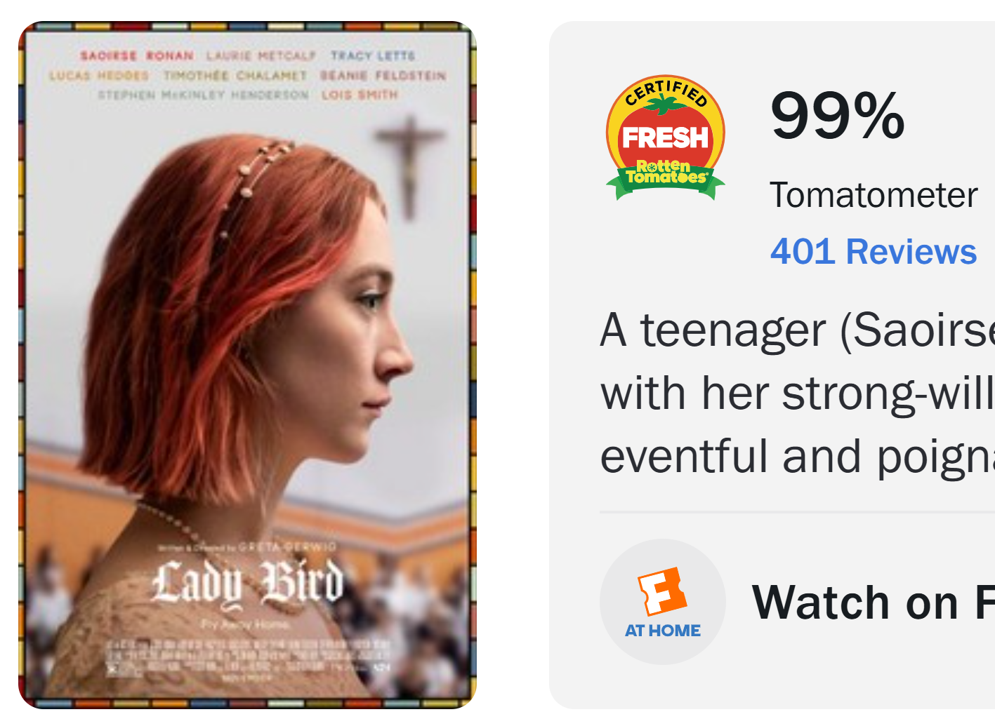 >>218228251It's just a really nice coming of age story with excellent acting from Saoirse Ronan and Timothee Chalamet, two of the best young actors at the time. It's not a must-watch can't miss movie but it's like hard to say anything negative about it, so on the tomato scale it should rightuflly color a deep red. I though this movie was really good