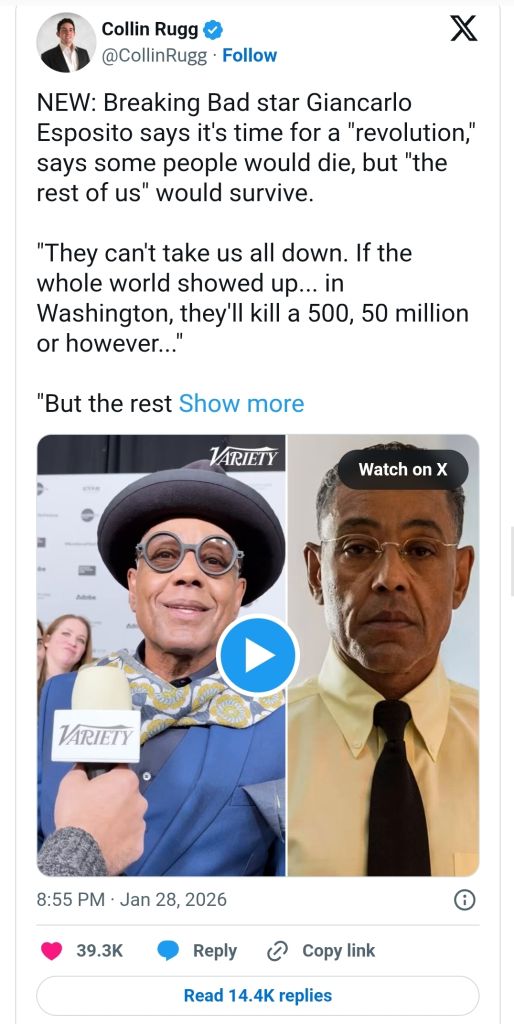 >leftist celebrities literally and openly calling for overthrowing the government And you all laugh when we say we're on the verge of civil war. I'll see you fags on the battlefield