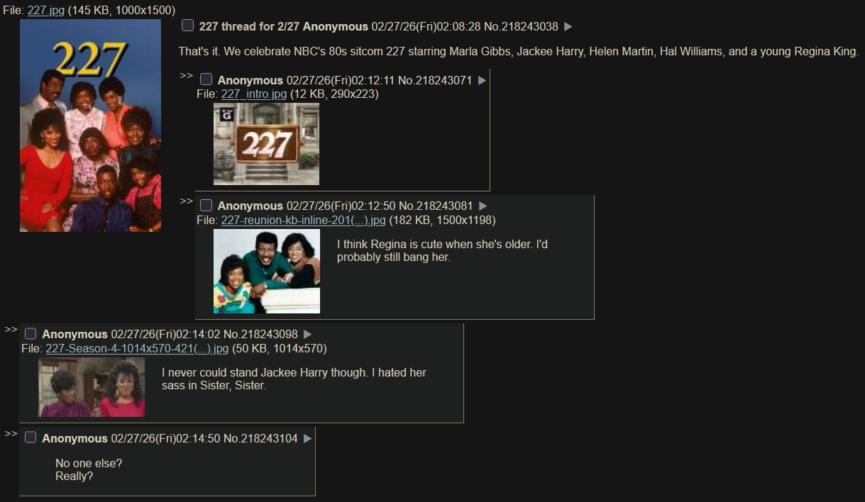 That's it. We celebrate NBC's 80s sitcom 227 starring Marla Gibbs, Jackee Harry, Helen Martin, Hal Williams, and a young Regina King.