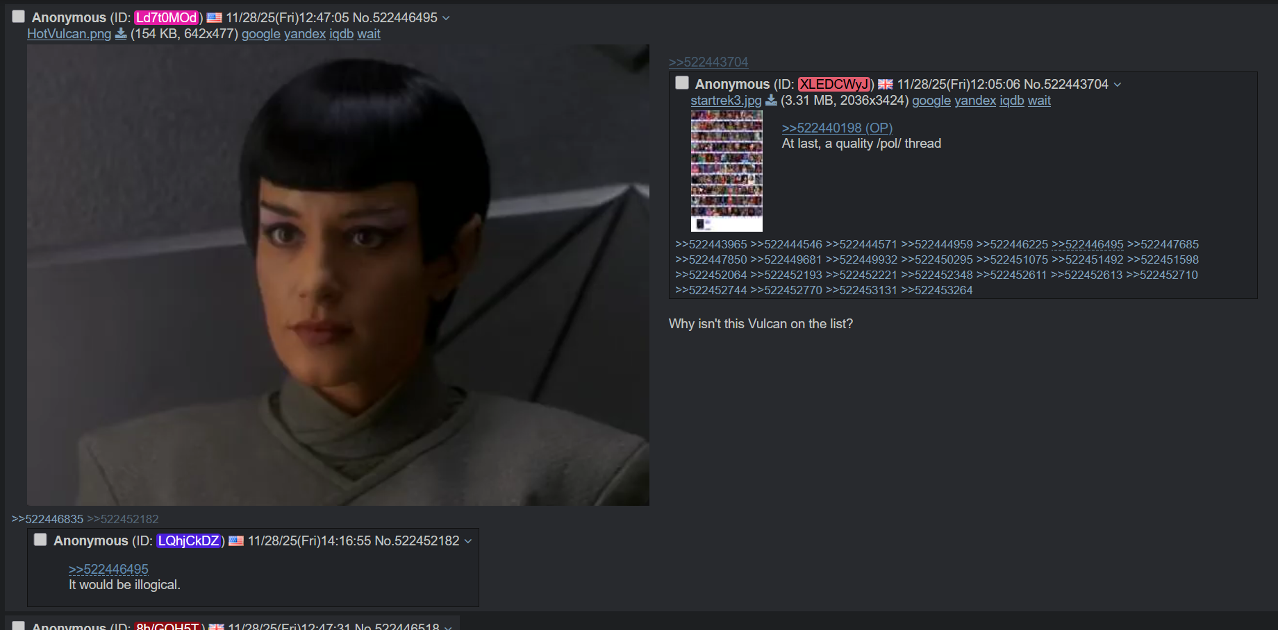 Does Klingon milk taste funky?>>218298878>if you don't think irrationally then you are obsessed with logicOr just obey logic instead of emotions, pretty simple, i don't know how to better explain it to your monkey brain other than it being like a speed limit for safety of yourself and others. Sisko acting a fool because he can't control his sub-Saharan African genetics should immediately invalidate him being in any command position.