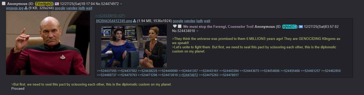 >>218286741All the talking points about how Star Trek was always progressive and socialist made me think the franchise wouldn’t click with me. But I started with TNG and the characters won me over near instantly.