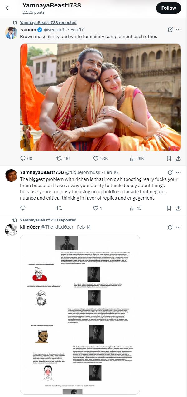 >>218297052I found the social media of some leftypol fag who posts on /tv/ who I now stalk and he reposts a lot of indian race mixing propaganda. It's pretty nuts. I think that they've just completely moulded their beliefs as being in opposition to 4chan. My point is that a lot of them aren't actual pajeets, it's just bunkerchan/leftypol discord spammers who treat posting on 4chan as a moral duty.