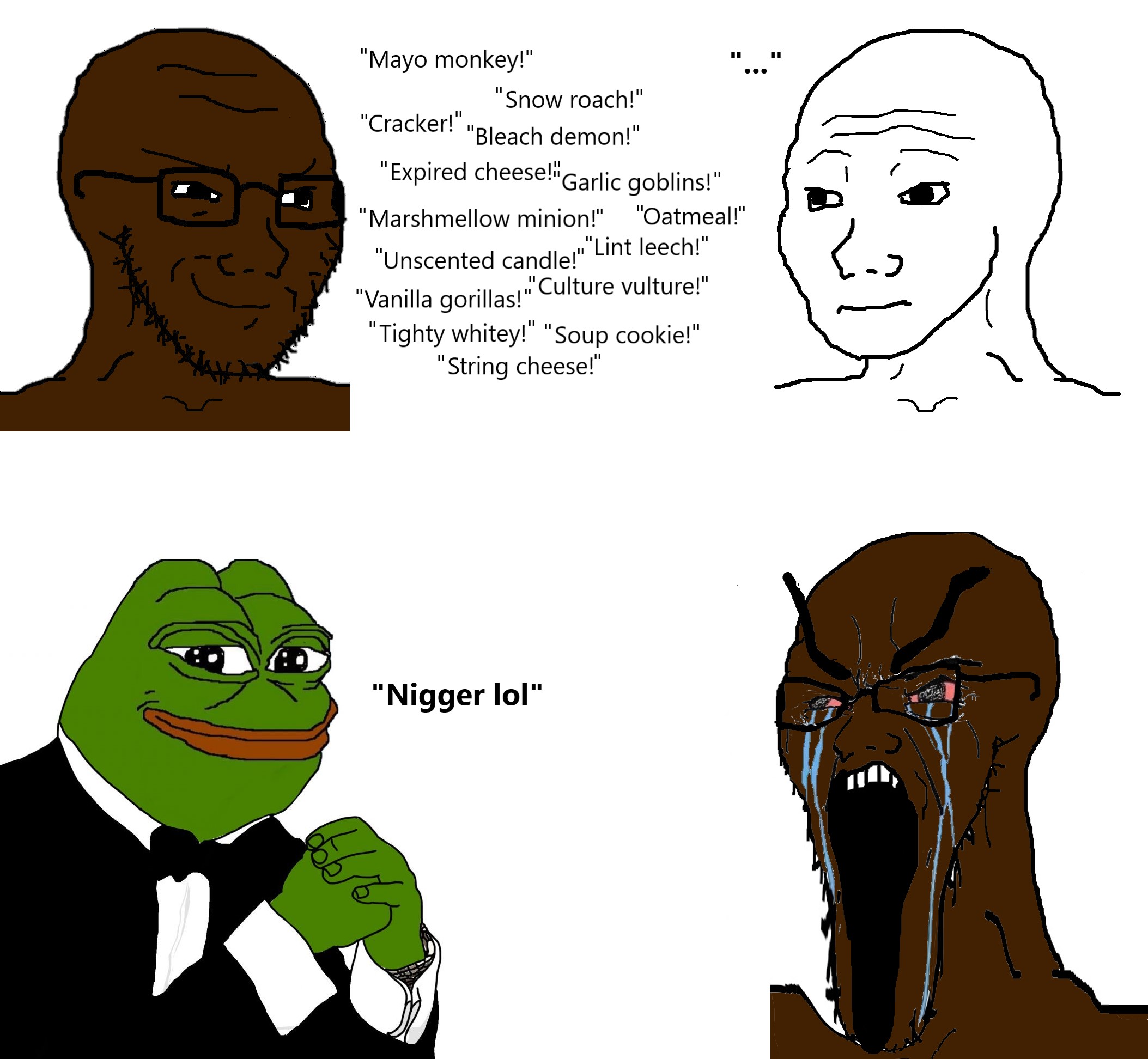 >>218296476It just doesn't work. "You're a cracker" thank God. Same reason chink doesn't do anything to the chinese, it isn't as good as being white, but it's still ok, better than most of the alternatives.The word nigger is offensive because blacks suck. Completely dependant on the good will of the other races to exist. Had equal rights for less than an century and most likely won't have them for another because they can't help but be annoying apes so soon the copious amounts of propaganda necessary to convince the rest of us that they're 'just as good' won't work anymore. You don't even actually need to say nigger, you can just say "you're black" and it'll have the same effect most of the time.