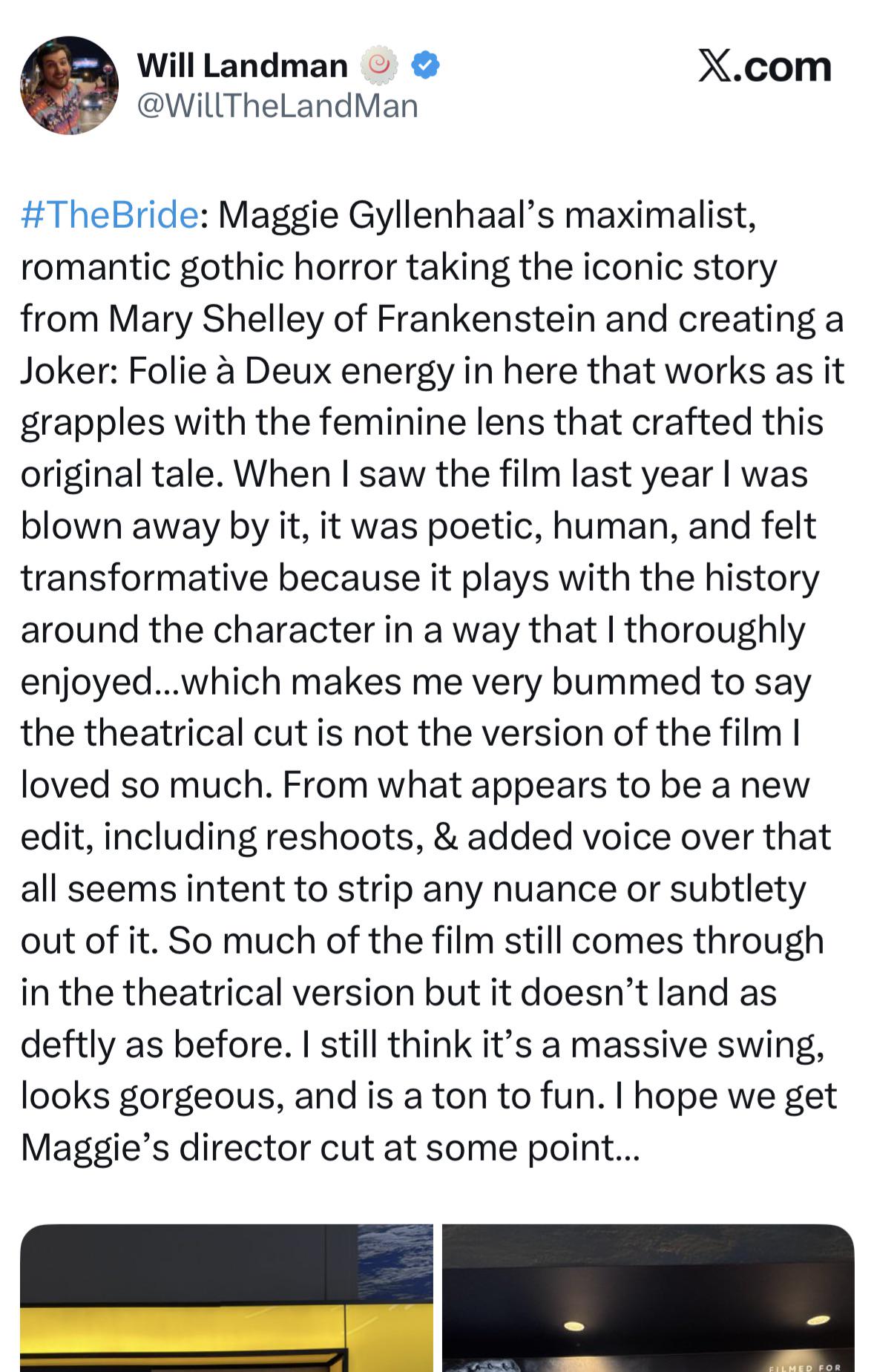>When I saw the film last year I was blown away by it, it was poetic, human, and felt transformative because it plays with the history around the character in a way that I thoroughly enjoyed…which makes me very bummed to say the theatrical cut is not the version of the film I loved so much. From what appears to be a new edit, including reshoots, & added voice over that all seems intent to strip any nuance or subtlety out of it. So much of the film still comes through in the theatrical version but it doesn’t land as deftly as before. I still think it’s a massive swing, looks gorgeous, and is a ton to fun. I hope we get Maggie’s director cut at some point…>Gyllenhaal recently admitted that the theatrical cut was not hers, describing the unusually intense testing of “The Bride,” with audiences and Warner Bros. executives scrutinizing the film’s depiction of violence and sexual violence. Viewers at early mall screenings flagged the film, which prompted the studio’s co-chief, Pam Abdy, to ask Gyllenhaal to soften some of the imagery; she acknowledged that what ended up in the final cut is “pulled back” from her original vision.https://www.worldofreel.com/blog/2026/3/8/the-bride-butcheredRELEASE THE MAGGIE CUT