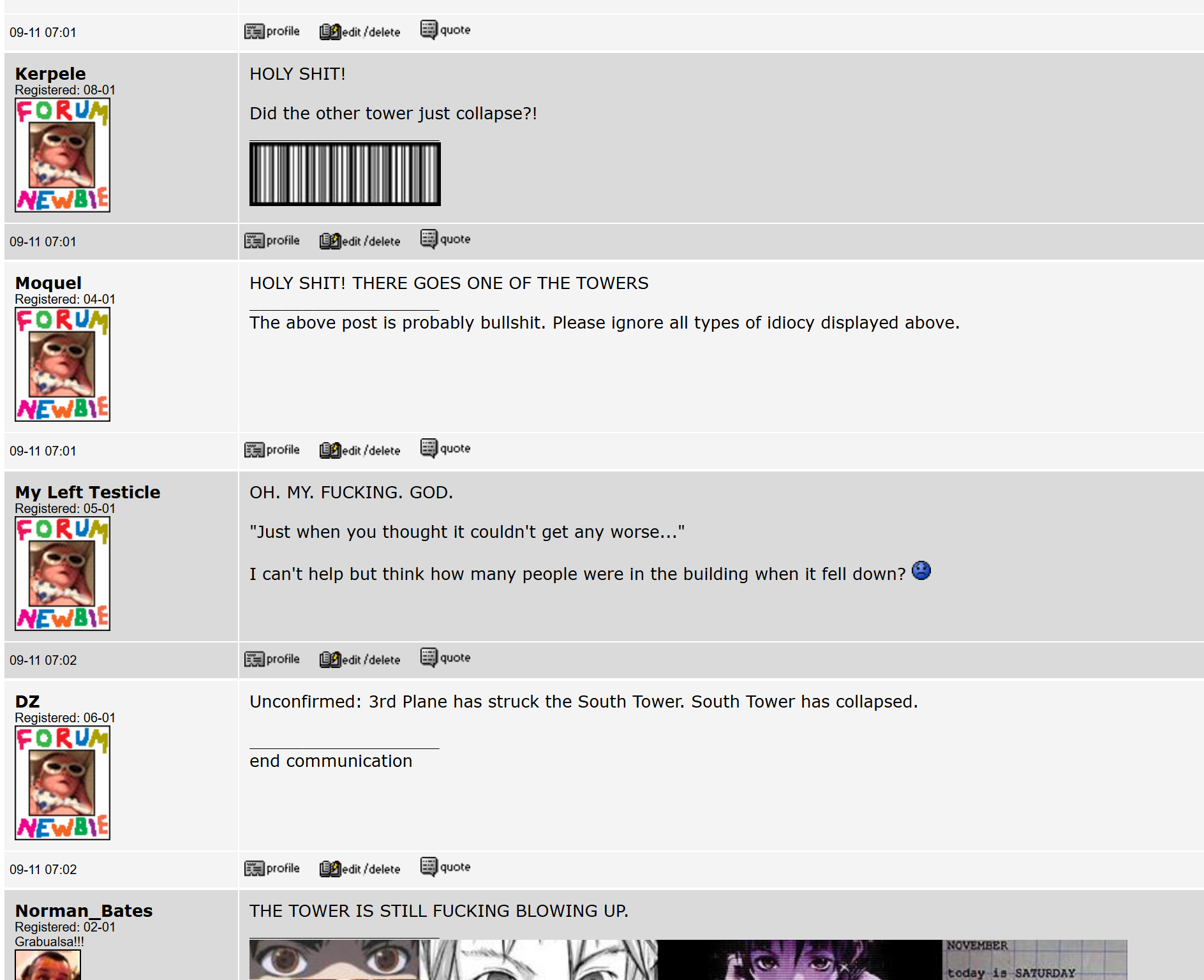 >>218422772>https://www.truegamer.net/SA_911/911%20SATHREAD/wtc01.htmlcrazy as fuck, reading the whole thread nowimagine if 4chan was around on 9/11