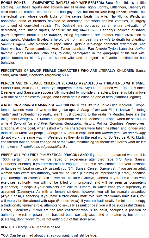I've read the entire article. The 'ASOIAF has dragons so why can't it be a feminist power fantasy' argument and complaining about female characters being the victims of violence whilst saying nothing about male characters being murdered, crippled, tortured, and sexually abused is silly. But it's not worth arguing with when the writer makes blatantly incorrect statements.