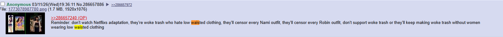 So what did we learn in today’s thread, everyone?>One Piece fans will defend kikes and netflix jewslop>One Piece fans can’t control themselves from posting fat fetish porn on a blue board>One Piece fans lose their mind when they see or hear about orange daddy