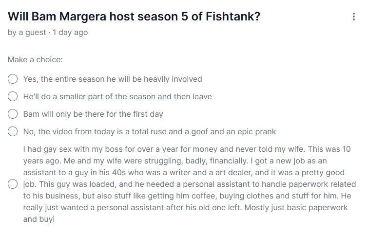 Will Bam Margera host season 5 of Fishtank?https://strawpoll.com/kjn1DbJa2yQ