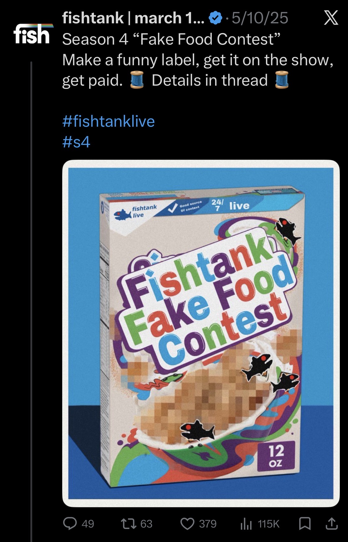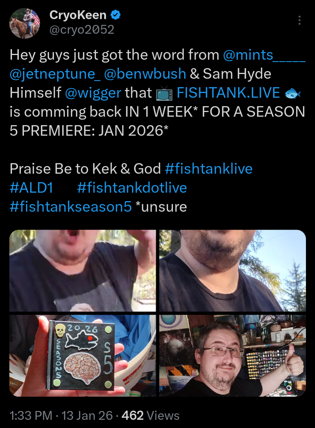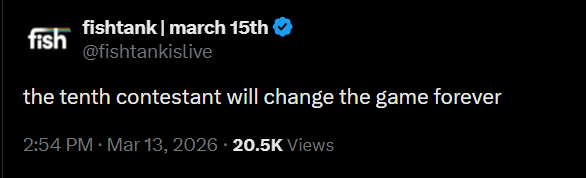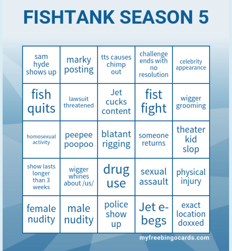 /tv/ edition>FTL NEWS:-- Television & Film STAR Brandom "Bam" Margera is hosting this season...-- It's premiere weekend for season 5!-- The MemeScreen TV will return for season 5...-- Watch season 3 episode 1 HERE: https://www.youtube.com/watch?v=Sx8mE09SPQ4 -- S5 start date: March 15th, location: Sandy Springs GA, duration: 30 days, S4 fish not returning, Bam Margera hosting... created by television actor Sam Hyde>Links:https://www.fishtank.live/https://x.com/fishtankislivehttps://old.reddit.com/r/fishtanklive/https://www.instagram.com/fishtank.live/https://www.youtube.com/@fishtankislive/videoshttps://fishtanklive.fandom.com/wiki/Fishtanklive_WikiPrevious: >>218508302
