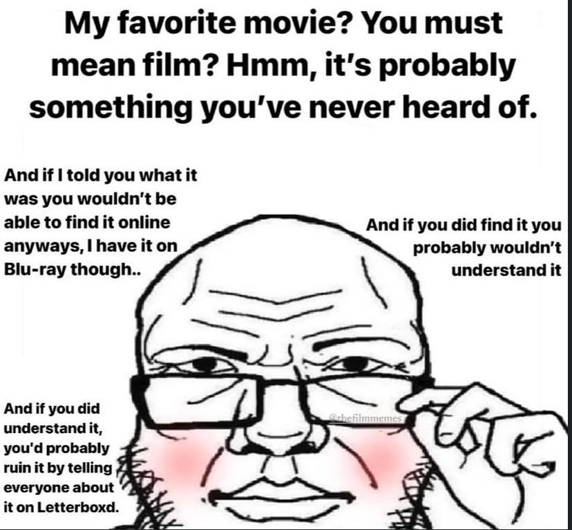 >>218559362The problem with being basic as fuck is it makes you an NPC and makes shit stale after a while. If enough people are basic, filmic taste becomes a Discord chat in which certain films become sacred cows and going outside of that boundary becomes shunned. People expect you to be the same as them and respect the status quo. A little bit of digging for original films never hurt somebody... it just shows you actually care for the artform. If your top 10 looks like LB's top, you're most likely not even a real cinephile, imo.