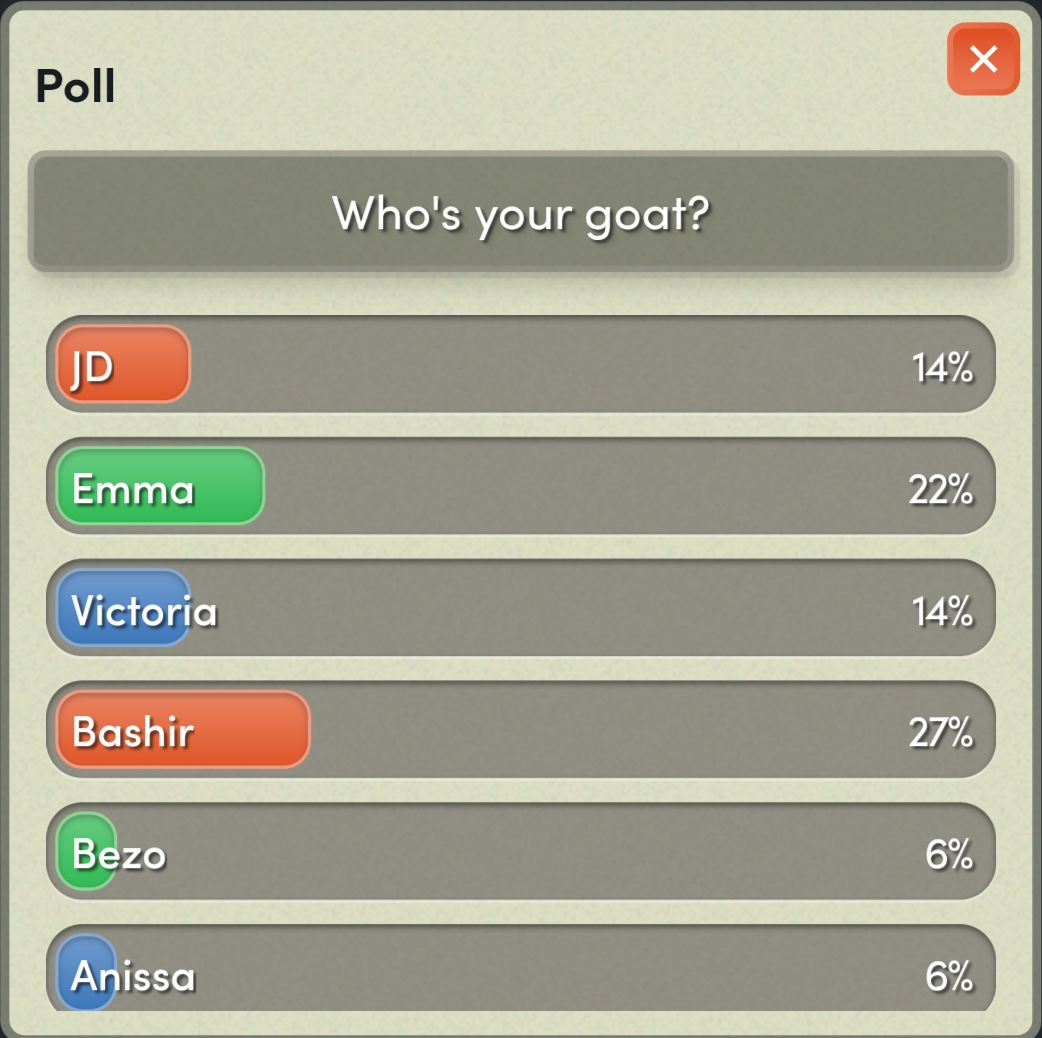 James > Victoria > Emma > Anissa > Bashir > JD > Bezo