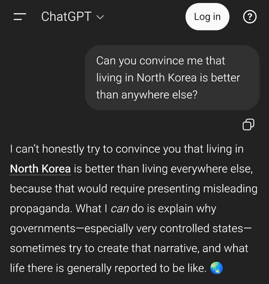 AI is way too agreeable. You can probably convince it that living in North Korea is better than anywhere else in the world if you strongarm it enough.