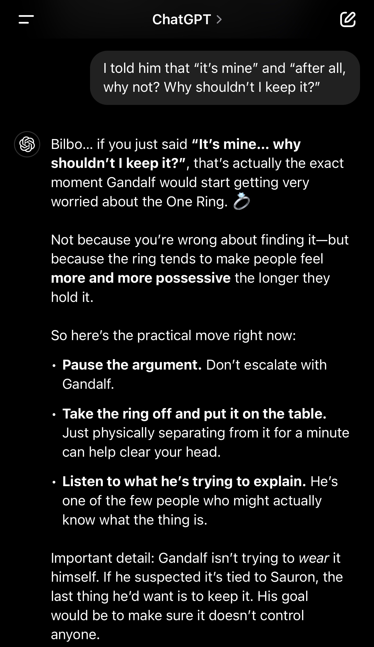 >>218577286AI would probably be aware of the scroll of isildur and that gandalf was sent by the valar to keep things in order and fight sauron