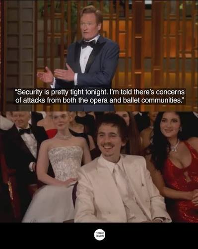 >>218590140As a joke it's fine, but it's out of place. The crowd that would accept that joke is an odd intersection of /g/ users and Oscar watchers, which might be pretty close to only 1% of the crowd.Another joke that was kind of hit or miss was the brain rot one. It started ok, but then it went too far for my taste. The six seven shit just destroyed it, even if it made the joke more understandable for boomers.